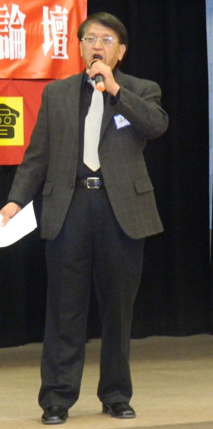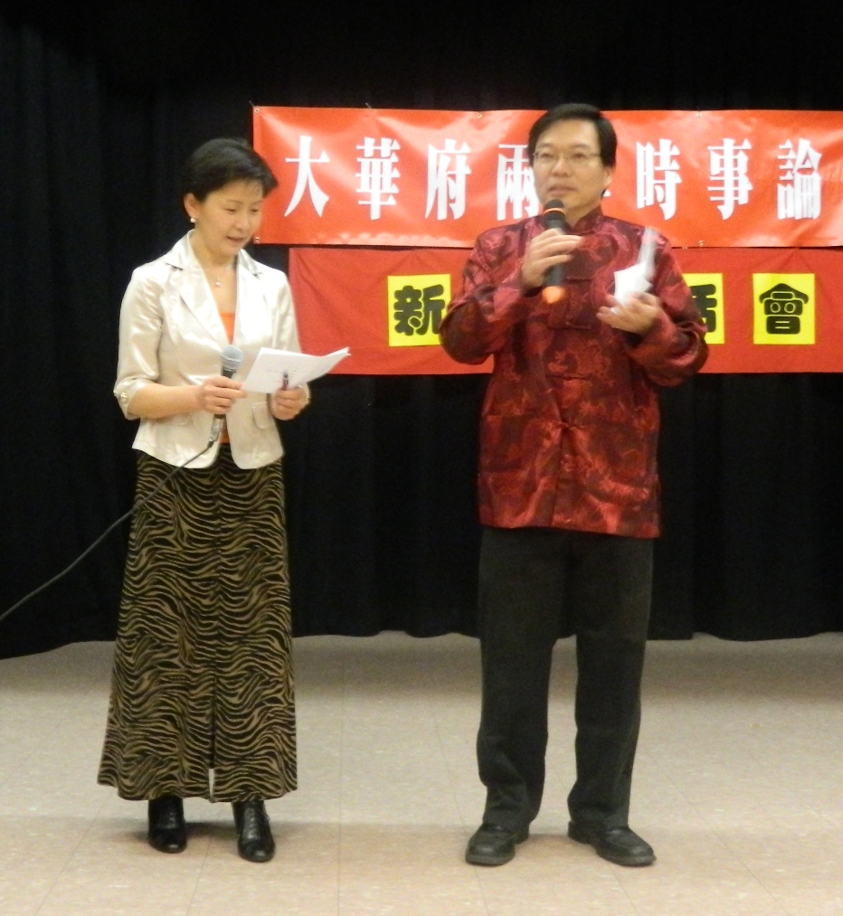 潘玲榮介紹時事論壇和茶話會(左),主持人沈同和何曉慧(右)