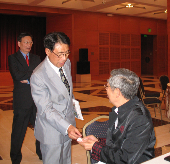 许嘉潞教授(右)与华盛顿和统会创会元老印铁林博士交谈。
